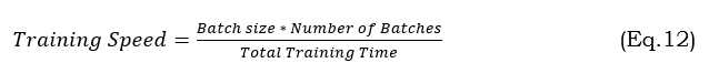 The rate at which a VQA model can absorb and apply new knowledge from training data is called its training speed. The common units of measurement are examples per second (e/s) or examples per hour (e/h), which represent the number of training examples processed per unit of time. Variables Influencing the Training Rate: Model intricacy, Resources available in hardware (GPU/TPU), Quantity of batches, Effectiveness of data preparation algorithm. Equation 12 shows the evaluation of training speed.