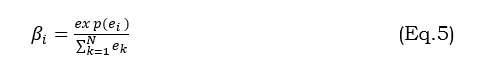 Let the attention weight for the i-th region of the image be denoted as β_i which is computed as in equation 5.