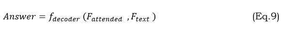 The final stage in any VQA system is generating the answer based on the obtained visual and textual information. It combines the attended visual features with textual features; a deep learning model decodes this multimodal representation into a textual answer. In the current VQA systems, attended visual features represent the most relevant parts of the image. They are first combined with the textual features extracted from the question into a multimodal representation. Then, this representation is passed through a decoder to generate the final answer. The final answer can be obtained by Equation 9.