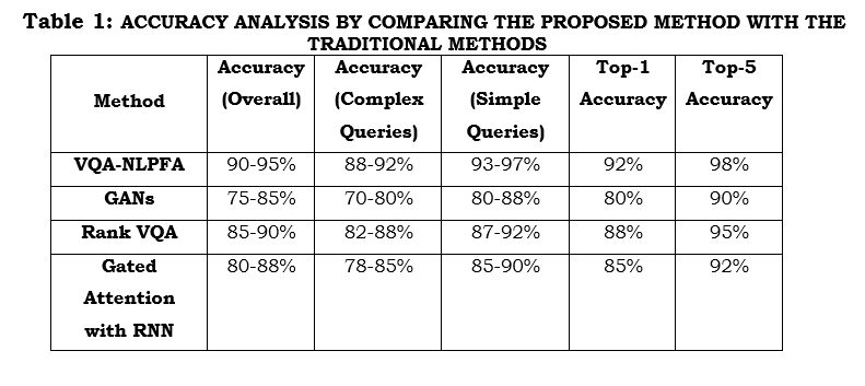 Table 1 provides an analysis of accuracy by comparing the proposed VQA-NLPFA model with traditional methods like GANs, Rank VQA, and Gated Attention with RNN across five key metrics: Overall Accuracy, Accuracy for Complex Queries, Accuracy for Simple Queries, Top-1 Accuracy, and Top-5 Accuracy. VQA-NLPFA reaching an overall accuracy of 95%. Since the complex queries involve the identification of attributes of objects in an image, the VQA-NLPFA scores 92%. This outperforms the best performance achieved by GANs, 70-80%, and Gated Attention with RNN at 85% since FA-enabled algorithms focus on the key regions in an image. In simple queries, this reaches up to 97%, outperforming GAN-based techniques which perform best at 80-88%, and Rank VQA at 92%. VQA-NLPFA reached a high Top-1 accuracy at 92%, and at an almost perfect score in Top-5 accuracy for different kinds of question types, its superior performance is nicely demonstrated at 98%.