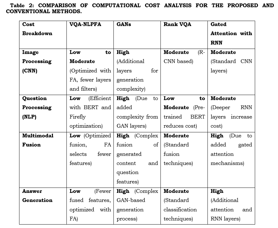 Table 2 compares the computational cost of VQA-NLPFA versus traditional models like GANs, Rank VQA, and Gated Attention with RNN. As a result of optimization by the Firefly Algorithm, VQA-NLPFA has lower computational costs at all steps: processing of the image, processing of questions, fusion of both, and finally producing the answer. This algorithm decreases complexity by choosing less but more representative features and fine-tuning the parameters, increasing efficiency. On the other hand, the GANs and RNN-based models incur a higher cost due to more additional layers and complex fusion processes that call for more resources. This all ensures better scalability for VQA-NLPFA in real-world applications by minimizing time and resource demands.