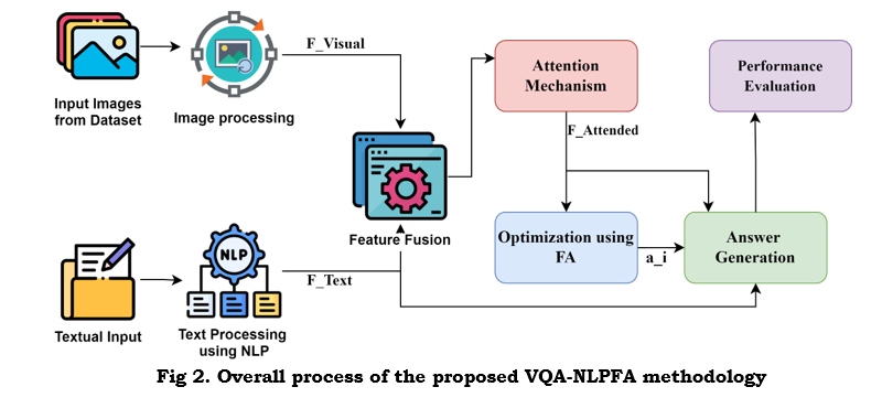 The VQA-NLPFA technique is nature-inspired optimization based on the Firefly Algorithm. This method aimed to optimize feature selection and tune hyperparameters in the model. In an algorithm of fireflies, they are considered the moving solutions in the optimisation space. In VQA-NLPFA, all main parameters of the model have been optimized by the Firefly Algorithm. In the case of a learning rate, each firefly will represent one value, where the brightness signifies the model's performance while guiding the movement to faster convergence. Fireflies also study various numbers of attention heads to achieve a good balance between model complexity and performance. In feature selection, fireflies represent the weights where the brightness is directly related to the model's ability to give importance to critical features. The FA also optimizes regularization terms for better generalization and reduction in overfitting. All these parameters- learning rates, attention heads, feature weights, and regularization- are thus adjusted by FA to make the VQA-NLPFA model achieve the best accuracy with much efficiency and scalability while handling visual question-answering tasks.