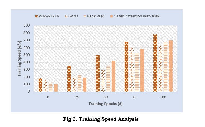 Figure 3 compares the training speed of the VQA-NLPFA model against those of other classic models, namely GANs, Rank VQA, and Gated Attention with RNN. From the figure, one observes that VQA-NLPFA reaches the highest training speed in several stages of training. Such performance is obviously due to the optimization by the Firefly Algorithm, hence speeding up the convergence through faster parameter tunings and feature selections and reducing overfitting. With improved training speed, the model is more efficient for practical purposes where time plays an important role compared to traditional models that require more computational resources and thus take longer in training.