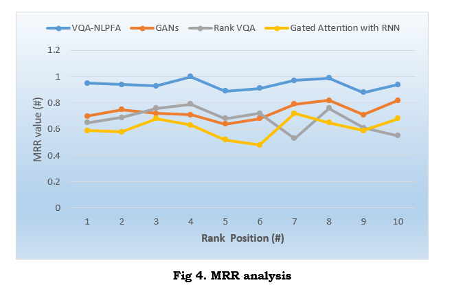 Figure 4 shows the MRR performance comparison for VQA-NLPFA against different models such as GANs, Rank VQA, and Gated Attention with RNN. VQA-NLPFA has obtained higher MRR scores, which proves the ability to rank the correct answer in a better position. This is due to its higher advancement in the attention mechanism and feature fusion of multimodal data for establishing better interlinking between visual and textual features. Further feature selection optimization by the Firefly Algorithm enhances the accuracy of ranking. Therefore, while VQA-NLPFA presents outstanding performance in the case of providing correct answers for complex visual questions, the traditional models show a lack of ability to handle that complexity, which shows up as lower scores in MRR.