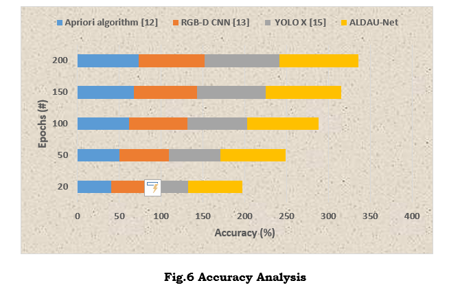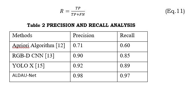 Here, standard approaches such as the Apriori algorithm [12], RGB-D CNN [13], and the YOLO X [15] are contrasted with the suggested ALDAU-Net methodology using measures such as F1-Score, Precision and Recall, Accuracy, and Localization Error.