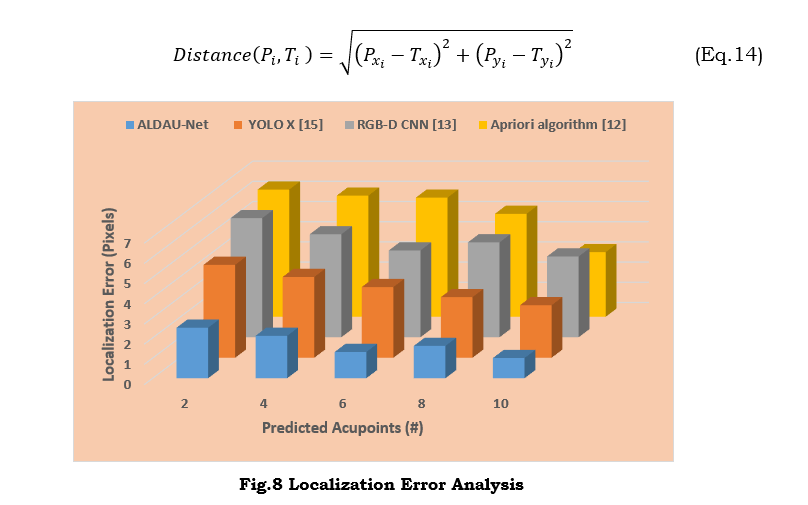 Localization error measures the distance between the projected acupoints and their actual ground truth placements. Acupoint localization relies heavily on spatial precision. It is obtained by equation 13.