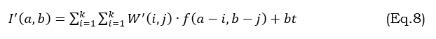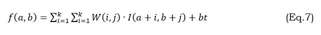 where f(a,b) is the feature map value at the position a,b. W(i,j) represents the convolution filter weights. I(a+i,b+j) is the input image pixel or the output from the previous layer. bt is the biased term, and k is the size of the filter kernel.