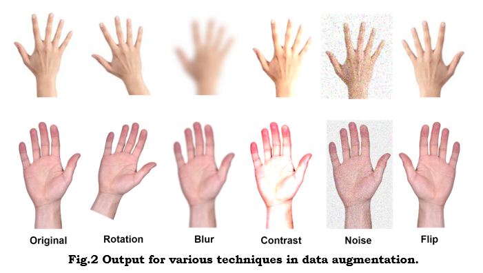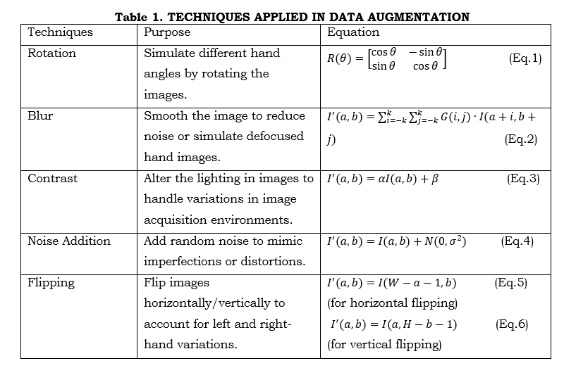 Data augmentation is one of the most critical steps since it increases robustness and diversity within a training dataset, enhancing a model's generalization capability for various types of hands, sizes, orientations, and other environmental conditions. By considering various augmentation techniques, this makes the data more realistic; therefore, it reduces overfitting in the model. The main goal of data augmentation is to simulate differences in the input images without further collection of real-world data. The model will have more opportunities to learn general features, which might increase its performance for different conditions: hand size, angle, illumination, and noise level. Table 1 shows the techniques involved in the data augmentation. Rotation can be done using Equation 1. The original image is blurred by Equation 2, and the image's lighting is adjusted using Equation 3. Noise is added to the image by Equation 4. Finally, the image can be flipped horizontally by Equation 5 or vertically by Equation 6.