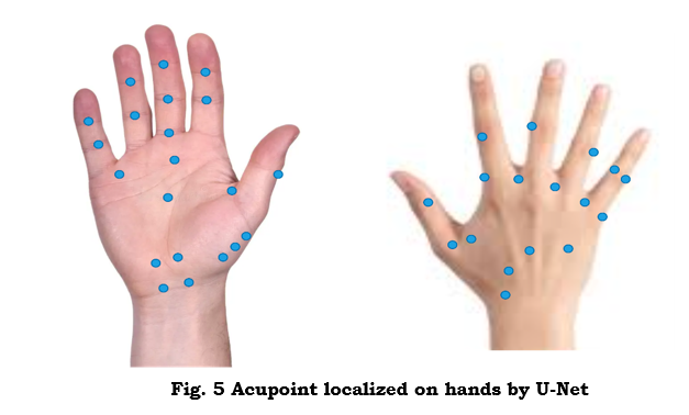 Chinese medical theory defines acupuncture points as special points in the body that can be stimulated to regulate the body's general balance and help relieve pain and inflammation caused by overexertion of muscles and joints [1]. Acupoint localization is an important part of acupuncture and tuina therapeutics; the accuracy of the localisation is directly proportional to the resulting therapeutic efficacy [2]. In general, acupoint detection refers to finding acupoints' location on human skin, which involves certain acupoints and their real positions [3]. According to the text description and diagram, it is possible to locate the acupoints roughly by those with no professional training in acupuncture. Still, there will be some errors for sure, and the location of them accurately is impossible [4]. An emerging field, AI-assisted acupuncture aims to improve therapeutic effects by making acupuncture treatments more precise and effective [5]. The present stage of acupuncture point recognition is being addressed by supervised deep learning, which possesses adaptability and flexibility. There will likely be an uptick in the development and use of AI-based solutions in healthcare systems [6]. Performing the conventional affine and elastic transformations—such as mirroring or rotating the initial picture, zooming in/out, changing, altering, and changing the colour palette—has been the most common and effective approach to data augmentation up to this point [7].
