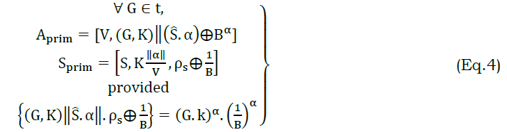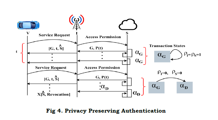 In equation (3), the variables Π andP−D ΠP−G denotes the transaction for the appropriate states. This is connected with Ŝ such that the service is sustained and hence the access failures and connected failures are reduced. The state models for transactions are used for providing different authentication formats. It depends on the state and action as defined in ρI=1 or ρS=1. Contrarily, if ρI=ρS=1, then the ΔR is high, reducing τ; the alternate case is the privacy preserving. If a transactionΠP−D is observed, then partial transaction authentication is required. Contrarily, if ΠP−G is observed, then a complete authentication sequence including V and S is required. The first preserves the V, disconnecting τ induced failures, whereas the later part requires V and S authentication preserving service endurance. The authentication for ΠP−D is discussed as follows. In this process, a conventional bilinear mapping-key based authentication is used. For a service grant process where ρS=ρI=1, the bilinear pairing between V and I is defined as (B×B):→[Aprim,Sprim]G=[Aprim]G . Here the Aprim and Sprim refers to the vehicle’s and service providers primitives for privacy. The primitives include a non-replicated key (k), a random generator α, and Ŝ. Therefore the Aprim and Sprim are defined as in equation (4)