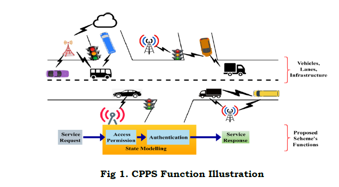The vehicles are interconnected, through access points and other infrastructures units. Therefore V2V and V2X communications are familiar in the proposed scenario. The functions are classified as state modeling and service processes. In the state modeling, access permission and authentication are administered. The classifier learning process defines the states and functions. Contrarily, the request and response are performed in the other process. In the function validation, the man-in –the middle adversary model is considered. A schematic representation of the same is illustrated in Figure 2.