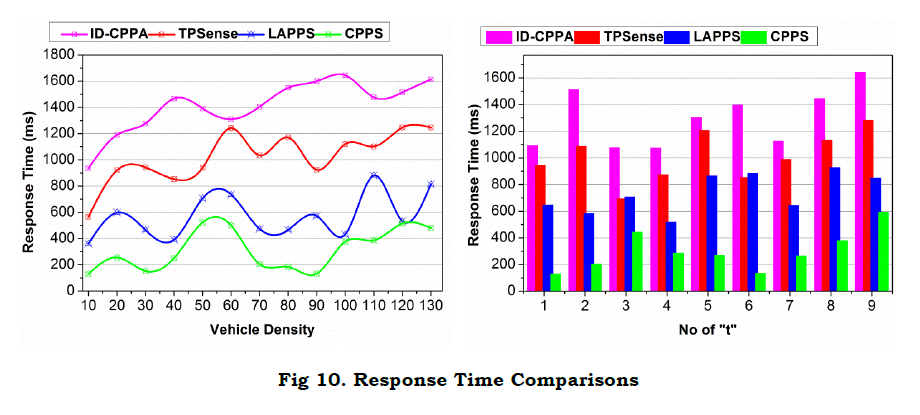 The proposed scheme achieves less response time compared to the other methods (Refer to Figure 10). The access is concurrent and swift for different V under contained privacy. In the permission delegation, ρI and ρS constraints are satisfied for maximizing ΔR. However if an adversary impact is observed, then the transaction determines the V state. Here, ΔRR is the reward factor that maximizes the communication rate without compromising time. In the privacy retaining case, the independent/ joint authentication for V and session “t” is administered. Therefore, G=1 and hence service response is high. For the R in “t”, the ΔR is congruent at some far “t” and therefore response time is less. On the other hand, an independent privacy retaining vehicle need not ensure a false communication. This is confirmed based on Ŝ and the final validation is performed based on (Aprim,Sprim). IT provides a durable communication security, preventing communication τ. Therefore, the passive communication support and interruption in V2V or V2X is less in the proposed scheme requiring less response time.