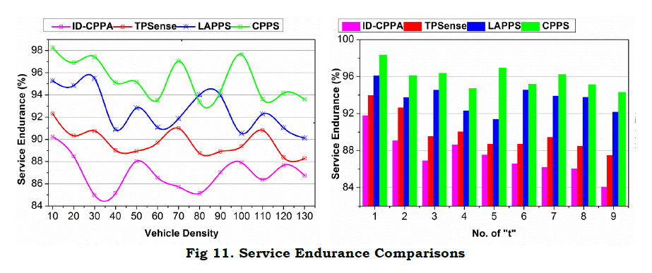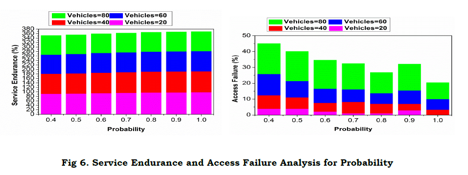 Figure 6 presents an analysis for service endurance and access failure for different probabilities. The probability considered is 𝜌𝐼.𝜌𝑆=1 wherein the individual; ratios may vary. As the endurance increases, access failure decreases confined to the 𝑆̂. In the maximizing probability the 𝑉 determines the available “t” and hence a process is defaced. Therefore, less is the vehicle density, high is the endurance and less is the failure. The independent and joint state definitions and ⨅𝑃−𝐺 determinations reduce the failure in resource access. The proposed scheme balances 𝑉,𝐺 for different privacy contained constraints maximizing the performance. In Figure 7, the revoked 𝑉, access and response time for different transactions and vehicles is presented.