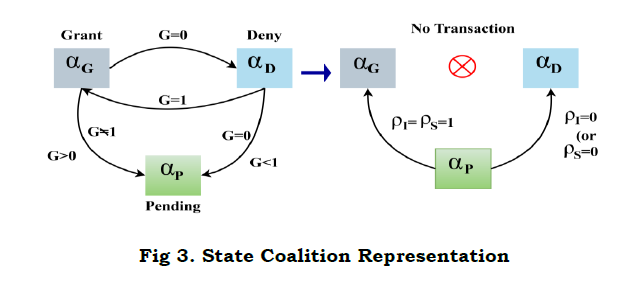 . The service level Ŝ defines the flexibility provided to the vehicle V throughout i=1 to t such that G=1.If G=0, then τ>ρ di ∀i∈[1t] and hence the service failure is accounted. Based on Ŝ, the service grant state of a V is defined as {αG,αD,αp} where in the grant, deny and pending are represented. A common coalition between the states represented in Figure 3.