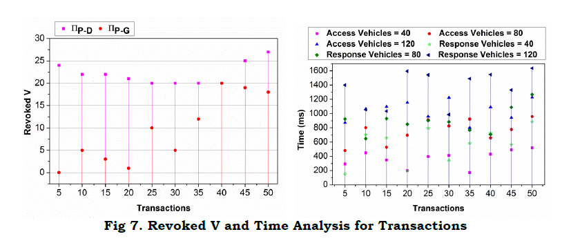 In Figure 7, the v′s revoked and time for different transactions are analyzed. The v’s revoked are analyzed under ⨅P−D and ⨅P−G transactions. In ⨅P−D the revocation is high as ⨅G−P id achieved first and hence the vehicle is not included in the communication. Contrarily, ⨅P−G reduces the revocation as both αD vehicles and new ones are augmented for the communication. This requires different access and response time, controlling the privacy and Ŝ. The changes are predominant in providing access to the Sand ρs.ρI=1 is retained. Therefore the access is mapped to the S based on their incoming time and hence the response. In different ⨅P−G ,⨅P−D × ⨅G−P , access and response is provided at precise intervals.