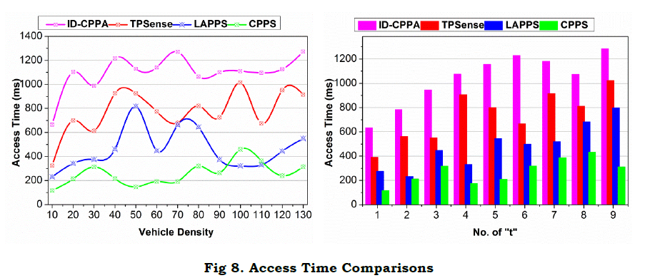 Figure 8 presents the comparative analysis for access time for different vehicle density and "t". The access time is comparatively less for different t and V by maximizing request process rate. In the proposed scheme, the v′s are integrated based on transactions defined by αD and αP. The pending state provides additional delay for the R in different t. First, if αp tends to αG, then G=1 is acquired and hence access time is less. Contrarily, if τ≠0 is observed, then the partial privacy preserving feature is instigated for maximizing access. The Ŝ is retained for the previous case whereas the Ŝ is defined from 1 for the second case. In G assessment based on ⨅P−G balancing as in equation (9) and (8), the ρS=0 or ρI=1 is first attained. If ρS=1 is achieved, then τtends to 0 and hence the revocation is denied. Therefore, access to service is provided instantaneously without reducing ΔR. Besides the state learning based allocations reduces the adversary impact and thereby frequent disconnections. This turns out in ⨅P−G and ⨅G−G independently. Therefore the v′s requests are momentarily analyzed without additional communication cost. The split in ρ[P(t)] and τ as in equation (8) defines the access level without intersection. Hence the proposed scheme incorporating above features, reduces the access time.