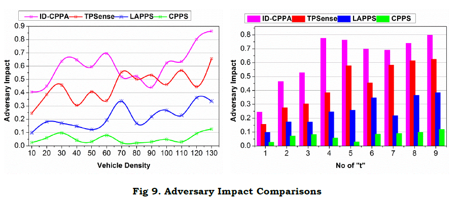 The proposed scheme achieves less adversary impact compared to the other methods. An illustration of the same is presented in Figure 9 for different v and "t". The considered impact of the man-in-middle adversary is combated using transactions and state modeling. First, the G for a V is designed as 1 such that ρI.ρS=1 is satisfied. There are two cases of adversaries considered (i.e.) the location of the adversary is to be considered. In ⨅P−D and ⊓P−G, the states are retained and new identity based privacy features are retained. Therefore regardless of the adversary density and location, the transaction defines its impact. For Ŝ defined in multiple instances of ⊓P−D and ⊓P−G, ρs=ρS=1 is verified. Based on this condition validation, (Ps⨁ 1B) ensures secure communication between the v′s. Therefore a "t" that breaks the closure in this instance reduces the adversary impact. In this context, the V is suspended from I and hence ρI=0. This means the least possible chance of v′s privacy is ensured. Further privacy post the transaction verification maximizes high security, reducing the adversary impact.