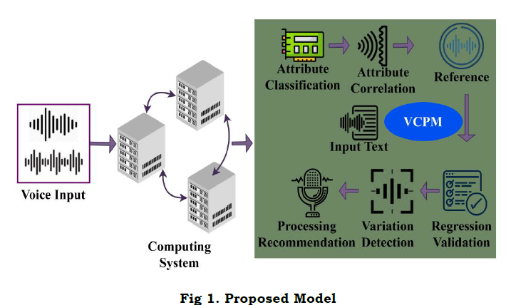 . The proposed model intakes voice commands or voice notes for performing defined operations. The computing system classifies the available attributes for correlation and reference finding. Based on the identified references, the regression learning and variation detection are performed. The recommendations are provided based on the achievable accuracy ensured in the process (Figure 1). The processing function of VCPM in NLP based application acquires inputs through voice signals (VI) observed in the human. The voice inputs are performed for attributes classification and correlation using regressive learning using the features audible and readable. The attributes classification output is aided for detecting the observation through attributes correlation from the gathered information. The function of VCPM is notices the multi-variant language processing problem in social computing that outputs in computational breakdowns where the voice initially filtered. The input of voice signal is represented as