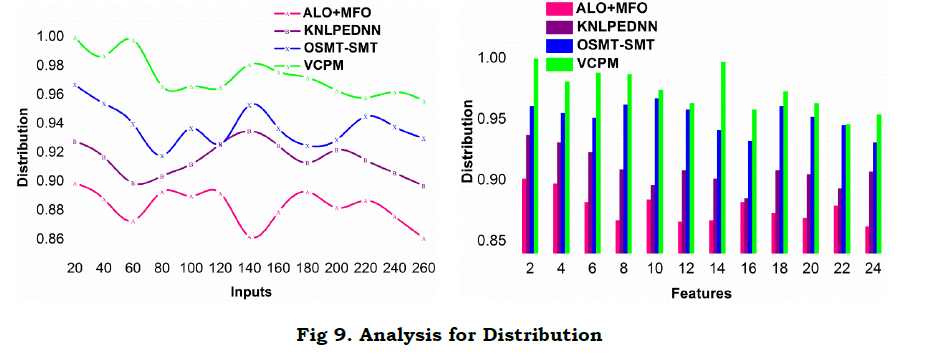 The proposed model is found to have high input distribution factor compared to the other methods. In the computational instances, the Δi and Δj determines the input requirement and RD[f(T)] validation. The input is initially not classified wherein RD⨁AD jointly performs the classification without leveraging the error. In the successive classifications as in equation (12), (13) and (14), the process is independent accepting multiple inputs. Therefore, the need for inputs and feature extraction is high compared to the previous f(T). This jointly exploits vI=vx(T)+ty(T) in f(T) defined instances and hence (q×T) is shared for the above AD and RD defined regressions. In the proposed model, the incoming VI are allocated with the existing RD or AD processing instances, classified by the features. This provides space for further inputs in the class increasing the distribution. Another classification is the concurrent utilization of the r[.] as defined in equations (6a) and (6b). Therefore, the available and Δi and Δj induced VI are distributed swiftly awaiting further q×T. Therefore, this factor leverages without variations in distingued inputs and features. Tables 4 and 5 present the comparative analysis summary for different inputs and features respectively.