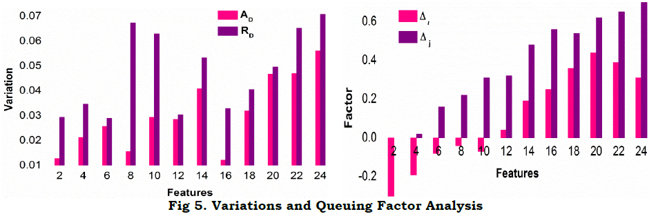 The correlation detection method is presented for Z and T wherein the α maximization is required. In the different combinational inputs, the precise Z is alone identified for reducing cy and its variations. The method of C VI+(1−α)Cx overlaps at any t such that, either C VIor Cx is increased (Figure 4). In this model, the reference with high PR is augmented for the social computing system. The following equation represents the regressive validation for deriving z based on the system efficiency, respectively. In this sequence of output of the computing system function as α=r[.]=1, the solution does not adapting any readable or RE. In the similar manner, the computing system assessment of Cx, Cy and z as per α is denoted, respectively. In this time the variation detection of the classification pattern is as follows In above equation (13), the condition (1−α)T serves as the processing recommendations. This condition is identified as mismatched in processing voice and text inputs using RE that aids the social computing system efficiency by changing the decisions for regularized efficiency of αT for processing recommendations Cy outputs computed as From the classification pattern functions solution of z for all cq×T∉vx or cq×T∈vx≤θ Table 1 presents the RD and AD classifications for differed features observed. The RD[f(T)] is indefinite as RD and AD is uncertain wherein the further processing is initiated. This distinguishes Z based on classification alone and thus, if AD varieties, then RD shows up the difference. This is observed until vx≤θ is satisfied. On the other contrary, if θ An observation analysis for the reference instances are presented in Table 2 for different features. The overlapping in Ztdt is identified based on the C1 to cq×T instances. This is observed in different sequence is augmented without compromising Z in cy outcomes, maximizing the references. The distribution factor observed for different features is presented in Table 3. The input distribution observed in different features extraction is presented in Table 3. The distribution relies on AD and RD based on (q×T) observed. In the αT maximizing instances, the RD[f(T)] is considered for defining further Δi or Δj. Therefore based on the queuing factor, the reference is defined for r[.] until c=1is achieved. This requires concurrency in Z detection wherein the input is overloaded for the observedZtdt. Therefore, the distribution is high if both AD and RD is balanced with the previous and current f(T). Figure 5 illustrates the analysis for variations and queuing factor under different features. Figure 5 presents the (AD,RD) variation, and (Δi,Δj) factor for different VI features observed. The AD feature is classified based on r[AD,T,f(T)] for which Z in equation (9) and (13) are considered. AnZtdt is required of a RD overlaps AD in which a non-linear results is obtained. The Δi or Δj is utilized for any one of Ad or RD for which the f(T) is positive. Contrarily for both the inputs, the AD,RD based on the reference, the distribution is performed. In distinct classification sequences, the (Δi,Δj) factor is balanced to be attained in a positive hike maximizing the accuracy.