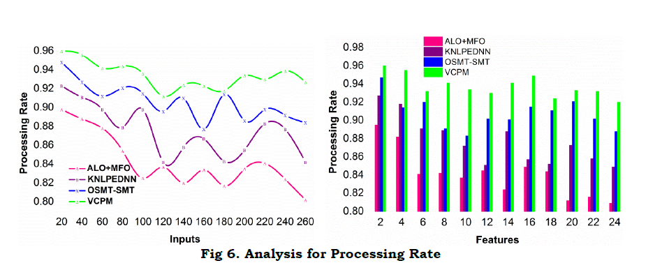 Figure 6 illustrates the comparative analysis for processing rate under different inputs and features. In the proposed model, 𝑣𝑥(𝑇) and 𝑡𝑦(𝑇) are distinguished for their 𝐴𝐷 and 𝑅𝐷 respectively, the 𝑐𝑞×𝑇 process is independently performed for the above features. In the first process, 𝑟[𝐴𝐷,𝑇] and 𝑟[𝑅𝐷[𝑓(𝑇)]] is estimated without 𝛼 consideration. Contrarily, in the 𝑞×𝑇 validation, the 𝑍𝑡𝑑𝑡 defines the existence of 𝑍 under regressive incidents, preventing its influence on 𝛼. Therefore, in the variation detection process the processing is improved from the 𝑅𝐷[𝑓(𝑇)] for 𝑅𝐷 in a non-regressive manner. In the consecutive sequences, the 𝑍𝑡𝑑𝑡 is identified under controlled variations, preventing failures. Therefore, (Δ𝑖,Δ𝑗) instances for single input based on features are improved. This improves the feature based correlations as in equations (7), (8) and (9). The empty slot for correlating sequence validation requires further processing under distinguished 𝐴𝐷,𝑅𝐷 maximizing the processing rate.