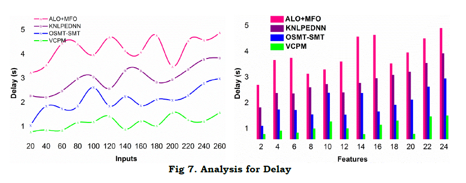 A comparative analysis for delay is presented in Figure 7 observed for different features and inputs. As seen in the illustration, the proposed model achieves less delay compared to the other methods. In the proposed model, the c′s sequence is distinguished for VI=vx(T)+ty(T),θ and 1T respectively. This classification is required for VI[f(T)≠vx(T) and hence the variations are suppressed such that Δi and Δj are varied based on multiple AD and RD. The regressive sequence verifies α based on all these instances such that RD[f(T)] is required in mitigatingZtdt. Therefore, the (Vx+ty) induced in error factor is confined under either of the equation (7), (8), or (9). Therefore, one sequence is suspended without maximizing the variation. Hence forth, delay is observed in any one instance, preventing additional computations. Depending on αT in all the three variations, the f(T) is remodeled for adapting delay less processing. Hence the α retained intervals are modeled based on distinct cy for preventing additional delay. This is harmonized for the features and inputs observed in different instances.