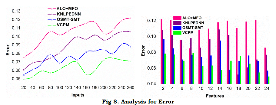 The proposed model achieves less error by maximizing α by mitigating Z under different conditions. First the Ztdt is analyzed for variations in regression and classification patterns. In the continuous iterations, ∀T∈1 to T×q, the overlapping case is identified for R∈ instances. Based on the iterations, cx∈vx and cx∉ty are identified without cvx estimation. This estimation does not detect any possible correlation in c1 to cq×T instances. Contrarily, the overlapping (1−α) in cx is detected for identifying Z in different classifications. This is mitigated underαT variations. The consecutive iterations correlates with RD[f(T)] or Δi and Δj for preventing final errors. The regression function distinguishesZtdt and Z for cy for reducing (1−αT) and hence improving c(q×T). The correlation for distinct features increases the error decreases and hence the successive possibilities are validated. The consecutive sequences are validated based on RD[f(T)] such that Δi and Δj are reorganized in RE. This implication is pursued only if the inputs increase for which Z [as in equation (13)] is observed. Therefore, the classification is performed based on features, for reducing errors (Figure 8).