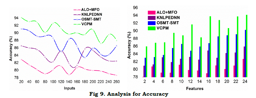 The proposed model achieves high accuracy for different features and inputs as presented in Figure 9. The α focused performance of the regression is presented using Z andZtdt validations in this model. Depending on the available (1−α)T estimations, the further RD and AD differentiation is performed. In the sequential process, cq×T is ensured for satisfying α=r[.]=1 wherein the accuracy is maximized. Regardless of the f(T) for the modified sequences, RD[f(T)] is confined based on the independent references estimated in equations (6a) and (6b). Therefore, as defined for the regressive sequences, c1 to cq×T is classified for either of Z as estimated in equations (12), (13) or (14). In this process, CvI∈cq×T αN=1,and vx≤θcq×T are independently defined for leveraging the α factor. However as the inputs increase, the α factor is initially unstable due to classification issues wherein it defaces. This is mitigated based on different intervals such that error due to Ztdt is confined. The process is repeated until the c for its maximum limit is achieved as distinguished by the correlating Tfactor. Hence the pursuing regression is modified based on Z and previous r[.]=1 as defined by f(T). This maximizes the accuracy factor for the proposed model.