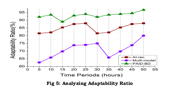 It is possible to gain knowledge of the capacity to adapt forecasting techniques to changing demographic circumstances by contrasting the actual precision with the anticipated accuracy. The ability to adjust the system is evaluated when actual reaction actions are assessed in terms of timeliness and efficacy compared to predefined agility criteria. This evaluation determines how quickly tactics may be adjusted in response to new threats. In these situations, researchers can evaluate the efficacy and robustness of big data-driven approaches to forecasting and preventing the transmission of infectious diseases by measuring the adaptability ratio. This research can provide valuable insights for future optimization efforts and serve as a roadmap for creating public health systems that are more adaptable and responsive, as shown in Figure 5 using Equation (4). π΄π (%) = π‘πππππ‘ ππππ ππ π πππππ πππ‘π’ππ ππ ππππ πππ πππ π ππ£ππ π π‘πππ (4)
