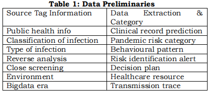 This research classifies the various data sources involved in healthcare events under some groups. The first big data category is the pandemic, which includes information about infectious illnesses' nature, dimension, level, and risk level. A second category is the big data in the pharmaceutical and medical industries, which primarily encompasses medical care, drug development and research, individual electronic medical records, and other similar areas. Third, the government has freely available big data, which primarily includes information about shifting populations, belonging, congestion, the environment, and other issues. Fourth, the big data generated by the internet, which typically originates through online involvement of general population, records of searching, transportation information transaction data, and so on. The information that individuals produce through the use of handheld devices has the potential to become "inactive" accumulating resources. Analyzing the data is the central component of the entire process of big data. This includes the analysis of the importance of pandemic details, the subjective attitude ability , and the forecast of epidemic progression, among other things. It accomplishes this by transforming data from several sources into mathematical models following the logic of the industry for needs in the business. This allows technology that is capable of generating autonomous outcomes in accordance with the demands of the algorithm in order to satisfy the process of making decisions requirements. On the other hand, the essence of data analytics is data modelling to support business decision-making. Furthermore, this dictates that the technique of analysis needs to be altered from fundamental investigation to skill learning, from reasoning to associative regulation, as well as from qualitative assessment to the enhanced interpretation of the matching of patterns. These changes are necessary since they are necessary in order to achieve the desired results. Table 1 defines the collected data preliminaries for analyzing the impact of big data.