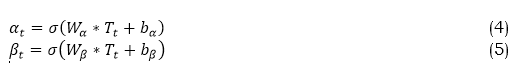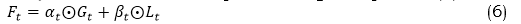 Where σ represents the sigmoid function that constrains the weights between 0 and 1. The other parameters from equations (4) and (5) like W_α and W_β indicates learnable weight matrices specific to global and local features in addition to the bias terms b_α and b_β. The fused features F_t at time t can be computed using an equation (6)