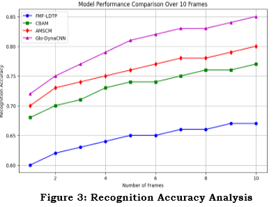 Figure 3 compares the performance of several emotion recognition models during a 10-frame period. The planned Glo-DynaCNN, FMF-LDTP, CBAM, and AMSCM are each shown as independent lines. The number of frames utilized in the facial expression identification is shown on the x-axis, while the recognition accuracy is shown on the y-axis. Glo-DynaCNN regularly outperforms the competition in terms of accuracy, especially when dealing with video data containing subtle emotional cues; this is true even when the no. of frames grows. While CBAM and AMSC have comparable trends, their accuracy levels are lower, indicating that the other models perform worse. The research goal is to improve the accuracy of expression identification from different facial patterns with varying feature detection using advanced modelling techniques, and this comparison shows that the suggested model is better at identifying expression tasks.