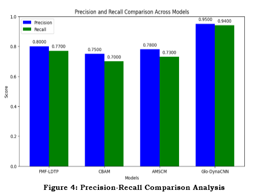 By calculating these performance metrics using ground truth input facial expressions and projected labels and then visualizing the results in a bar chart as shown in Figure 4, this algorithm compares the recall and precision of four models with an existing algorithm like FMF-LDTP, CBAM, AMSCM, and the proposed Glo-DynaCNN. Regarding recall and precision, the results reveal that Glo-DynaCNN is the most effective and accurate model for classification tasks. In light of this, the suggested usage of Glo-DynaCNN is justified since it has proven to be an effective model for enhancing decision-making in applications like facial expression identification and performs feature extraction in both global and local ways of each facial region.