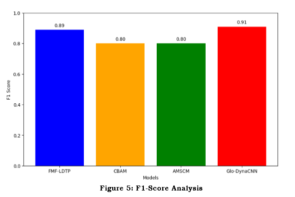 Figure 5 depicts simulated ground truth labels across ten frames; the plot compares the F1 scores of four models: FMF-LDTP, CBAM, AMSCM, and the proposed Glo-DynaCNN. Glo-DynaCNN has the best performance in accurately categorizing emotions, as seen by its highest F1 score. This finding demonstrates the model's efficacy and promise for enhancing expression recognition tasks, contributing significantly to the field's future facial expression applications.