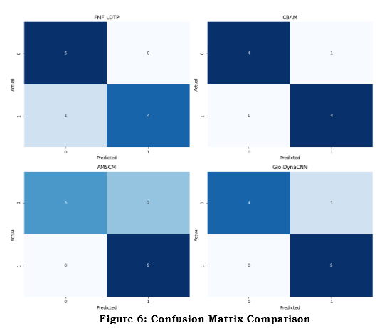 Figure 6 illustrates the confusion matrices for four models tested for facial expression classification: FMF-LDTP, CBAM, AMSCM, and Glo-DynaCNN. The confusion matrices visually show the number of true positives (TP), true negatives (TN), false positives (FP), and false negatives (FN) for each model to compare the models' performance in emotion classification tasks. Glo-DynaCNN and AMSCM reached five true positives, showing they are good at detecting positive emotional expressions. Nevertheless, Glo-DynaCNN surpasses AMSCM due to its lower occurrence of false positives, which lowers the probability of incorrectly labelling negative cases as positive. In this particular situation, Glo-DynaCNN stands out for its dependability and accuracy, making it the ideal choice for expression classification of facial movements.
