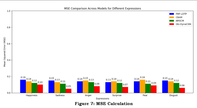 Figure 7 compares the MSE of four expression identification models, including FMF-LDTP, CBAM, AMSC, and the suggested Glo-DynaCNN for analysis. The six expressions of joy, sadness, anger, surprise, fear, and disgust are used to measure the performance of each model. While the current models have much larger MSE values, which means they aren't very good at making predictions, Glo-DynaCNN has much lower MSE values, which means it's much better at identifying emotions. This visualization showcases how the proposed Glo-DynaCNN model outperforms previous methods, supporting its promise for improved emotion recognition in real-world scenarios.