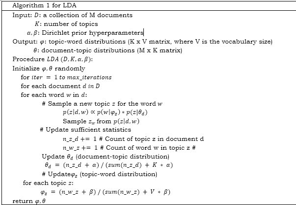 For algorithm 1, divide the document-topic distribution (θ) and topic-word distribution (φ) randomly to start. Until a certain number of cycles occur: In data set D, for every document d: In document d, for every word w: Choose a new subject z to represent the word w by taking into consideration the likelihood p(z | d,w), that is directly proportional to the sum of the probabilities of the word w given z (p(w | φ_z )) and z was given document d (p(z |Y_d)).Keep the appropriate statistics up-to-date, including n_z_d (the number of topics in record d) and n_w_z (the number of words in the subject z). Use the counts n_z_d and Dirichlet's prior α to update the document-topic distributions θ_d . Using the numbers n_w_z and the Dirichlet's prior Ų, update the subject-word distribution φ_z for each subject z.