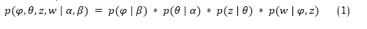 For each subject k ranging from 1 to K, create a Dirichlet distribution φ_k for β. In the case of every document d from 1 to M,assign a subject percentage θ_d ~ Dirichlet(α). In document d, for every word〖 w〗_n, a subject assignment is drawn using the multinomial function θ_d. Express a word 〖 w〗_n, as a multinomial of φ_z (n). In this context, α specifies the Dirichlet prior parameter for the topic distributions per document and β denotes the per-topic word distributions. Equation (1) shows the formula for the joint distribution of the LDA model,