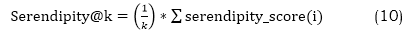 The serendipity@k metric measures the proportion of unexpected or incredibly relevant items in the top k recommendations given to a user. The metric examines the system's ability to recommend relevant yet unexpected items to improve content discovery and user satisfaction. To calculate Serendipity@k, a metric measuring the degree to which a relevant item surprises a user is required. Taking advantage of the item's reputation or the user's familiarity with it is a common tactic. It is more surprise or serendipitous when an object is less well-known or popular. According to equation (10) the Serendipity@k computation is as follows: