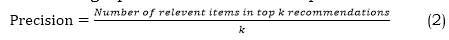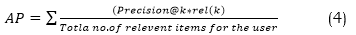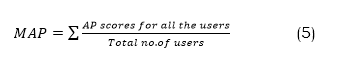 In the above equation (4), the variable "k" represents the recommendation's position or level of importance. The term "list" refers to a collection of items. The function rel(k) is a binary function that evaluates whether the thing at rank k has significance, returning 1 if it is relevant and 0 if it is not.The Mean Average Precision (MAP) is computed by taking all users' average of the Average Precision (AP) values.