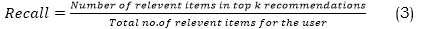 • When it comes Regarding the top k recommendations, Recall@k measures how many relevant items there are compared to the total amount of relevant items for a user. The calculation is as follows equation (3),