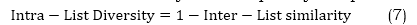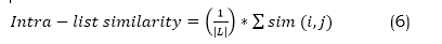 Intra-list diversity: Intra-list diversity refers to the degree of dissimilarity or diversity among the things recommended within a user's list. It aids in measuring the extent of variation in recommendations given to a user so that the suggestions made are not overly similar or repetitive. Intra-List Diversity is sometimes assessed using a metric called Intra-List Similarity. This measure is calculated in the following equation (6),