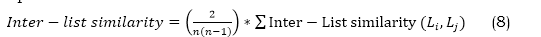 Here, N represents the overall quantity of users. Li and Lj represent the lists of recommendations for customers i and j, respectively. The Inter-List Diversity is then computed using the equation (9),