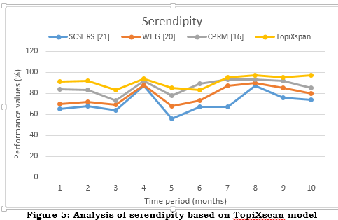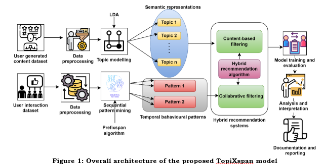 In conclusion, TopiXspan provides a novel and efficient approach to online content recommendation. By combining topic modelling with sequential pattern-mining gets closer, TopiXspan overcomes the limitations of conventional recommender systems. Given this integration, it can adapt well to ever-changing user tastes and media environments. Utilizing user-supplied data, TopiXspan's subject modelling component—which employs LDA—gathers a semantic representation of customer tastes and content qualities. By revealing changes in tastes and temporal behavioural dynamics, the Prefixspan technique finds successive patterns of user interactions all at once. Personalised suggestions that are thematically relevant and adaptive to users' changing consumption patterns are offered by TopiXspan through a hybrid approach that merges content-driven and cooperative filtering algorithms. According to comprehensive assessments carried out on actual life social media datasets, TopiXspan surpasses traditional recommendations if it comes to the accuracy, diversity, and serendipity of suggestions. The study's results highlight the possibility of improving recommendation quality in content-rich situations by merging topic modelling and pattern mining. TopiXspan is changing the game regarding recommender systems; it improves social media platforms' user experiences by recommending relevant, engaging, and distinctive content that changes.