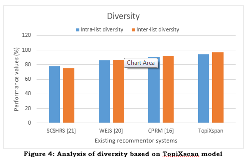 As shown in Figure.4, a greater Inter-List Diversity score signifies increased disparity across the suggestion lists produced for distinct users, showcasing the system's capacity to deliver individualized and varied recommendations that cater to each user's own tastes and interests. Recommender systems rely heavily on both intra-list and inter-list diversity metrics. In order to decrease the production of bubble filters and increase user content exploration, they assess the system's ability to provide diverse and non-repetitive recommendations.