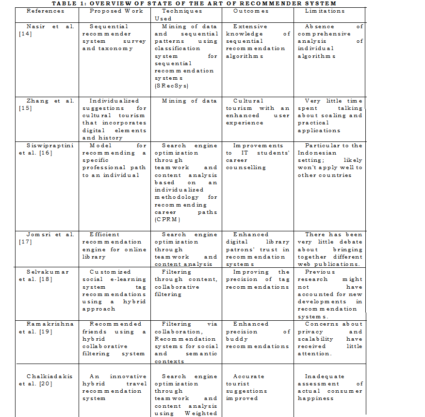 Reading up on the most recent studies in recommender systems is one approach to getting a sense of where the field is. Digital libraries, e-commerce, education, and tourism are just a few subjects covered in these articles that tackle issues including data shortages and cold starts. This study employs collaborative filtering, content-based filtering, and hybrid approaches to give consumers specific suggestions. Personalized trip recommendations, social network buddy suggestions, student career path assistance, and e-commerce sequence recommendations are all important topics. Table 1 shows the latest findings from meta-analyses and studies aimed at enhancing suggestions' precision and the user experience's quality.