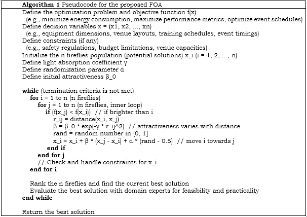 Optimizing ice and snow activities is the speciality of the offered approach, which integrates the FOA with MEC. Whether you're trying to optimize venue design, minimize energy consumption, or maximize athlete performance, it will outline an optimization issue. decision variables, and restrictions. Before deploying the MEC infrastructure—which consists of the edge nodes and an orchestrator—at the appropriate places, a first population of fireflies is created, representing viable solutions. The edge nodes, part of the main loop, receive all possible solutions and use their computational power and low-latency capabilities to process and assess them locally. To handle restrictions, the algorithm then moves Firefly towards brighter solutions by following the conventional FOA stages. Domain experts assess the best solution, and the process repeats until termination requirements are satisfied. This process culminates in the return of the optimal solution, which integrates FOA and MEC for optimal efficiency and practicality in the ice-snow sports sector.