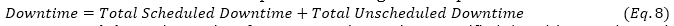 b. Downtime: This metric measures the sum of all the times operations are stopped because of maintenance or other problems. It is given in eqn 8.