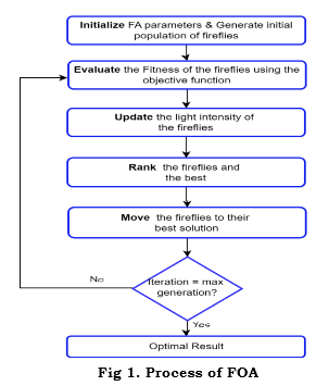 Fig 1 shows the FOA flow chart. The FOA randomly assigns fitness values and placements to a population of fireflies. The light variance in intensity is subsequently defined, with higher intensities indicating better solutions. In accordance with the distances they travel and light intensities, the algorithm determines the attractiveness of each firefly to brighter fireflies. Based on their attractiveness and a randomness element, each firefly travels towards the brighter one. After assessing its suitability, a firefly will change its location if it finds a more suitable one. The process terminates if a termination requirement is satisfied, such as the maximum number of iterations or good solution. At last, the method returns the firefly population's optimal answer.
