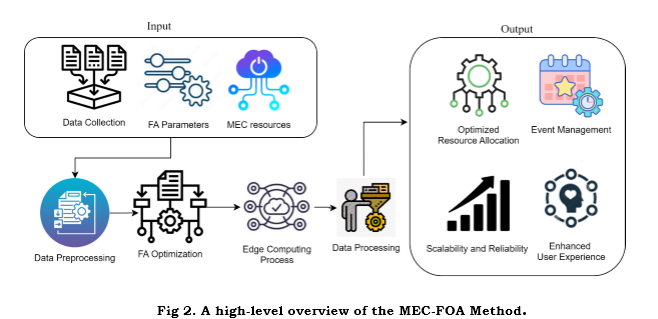 Fig 2 shows the overall process of the proposed MEC-FOA method. By applying the proposed MEC-FOA framework, the ice and snow sports business aims to optimize resource allocation and enhance customer experience through enhanced real-time data processing. Data from ski areas and sports facilities infrastructure, user preferences, information about past and present weather, details about sporting events, data collected from IoT sensors at venues, and historical meteorological data are all inputs. FOA begins by setting up some initial values for variables like population size, attractiveness, and movement dynamics. Then it updates the positions of the fireflies, analyzes fitness functions, and finds out how to distribute resources optimally. Using MEC, computing activities may be transferred to edge nodes, guaranteeing processing with minimal latency and allowing for dynamic resource distribution throughout the network. The process consists of multiple steps, such as cleaning and normalizing input data through data preprocessing, initializing the model, and optimizing using FOA to attract and guide fireflies to ideal solutions. Efficient task processing at the edge nodes is guaranteed by MEC-managed assigning tasks and resource allocation, which undergo continual modifications in response to real-time sensor and user input data. This integrated system improves resource usage, schedules and manages sporting events better, and provides users with better personalised services and recommendations, which leads to better user experiences. Future planning and enhancements can be informed by the extensive data insight and reports provided, which offer useful information about the utilization of resources, event results, and user satisfaction. Because of its scalability and agility, the system can manage growing amounts of data and requests from users, respond instantly to changing conditions to keep people safe, make it more fun, and make the ice and snow sports sector run more efficiently. The following sections discuss the proposed method's uses in the ice and snow sports industry.